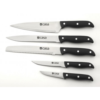10mm thick stainless steel is one solid piece & the 2 handle pieces are pinned on to the blade, one on each side. The knife set consists of 1 x 8" Chef Knife - 1.5mm, 1 x 8" Slicer Knife - 1.5mm, 1 x 8'" Bread Knife - 1.5mm , 1 x 5" Utility Knife - 1.2mm and 1 x 3.5" Paring Knife - 1.2mm.