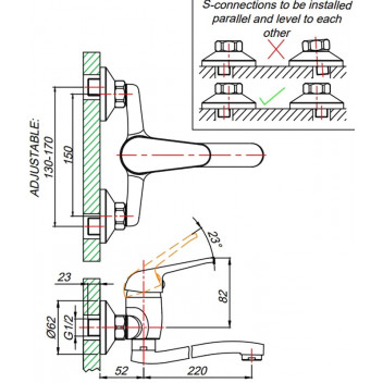The Mixed Solid range wall type sink mixer has a swivel spout and the reach is 271mm. Included with the mixer are 2 x S-connections and coverplates. The inlet centres are 150mm apart and adjustable from 130mm to 170mm.