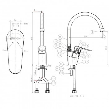 Amazon pillar type sink mixer. Flow rate restricted to 6.2 litres per minute. G1/2 female connection ends. Single lever. Single hole installation. Flexible connection hoses. Rapid installation system.