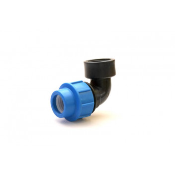 Compression fittings are suitable for use with the whole range HD Polyethylene pipe. This female elbow fitting connects between a length of HDPE pipe and a male threaded fitting, at an angle of 90°.